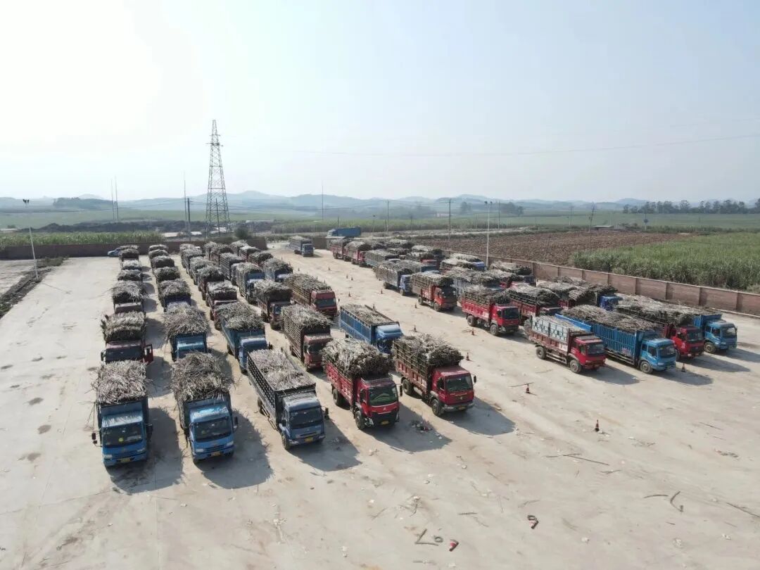 2023/2024年榨季期间,广西糖业集团昌菱制糖公司蔗区的运蔗车辆在停车场排队,等待叫号入厂压榨。