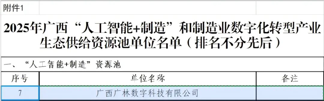 近日,自治区工信厅公布2025年广西“人工智能+制造”和制造业数字化转型产业生态供给资源池单位名单,广西广林数字科技有限公司(简称广林数科公司)成功入选“人工智能+制造”资源池。