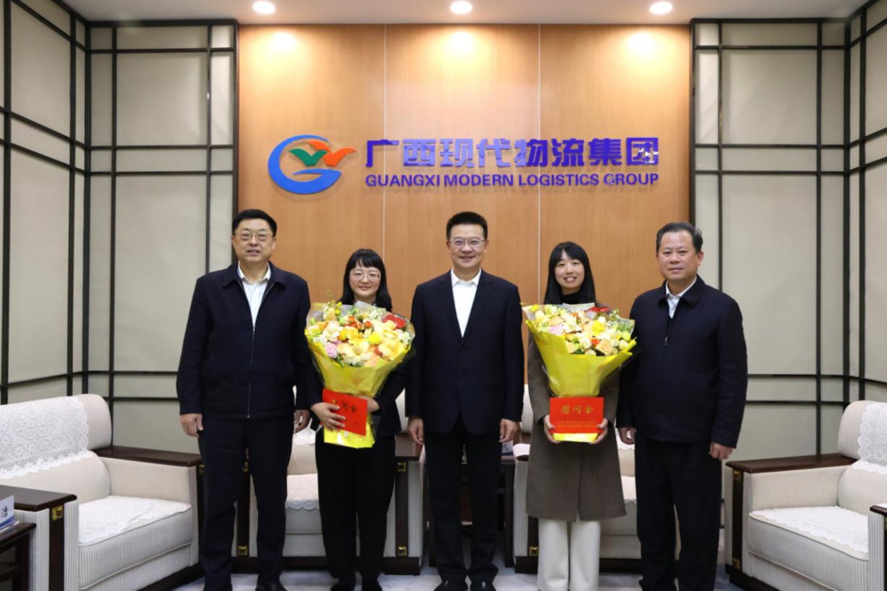 自治区副主席、自治区国资委党委书记胡帆(中)慰问国家级教学成果奖二等奖及全国教材建设奖二等奖主持人、自治区国资委系统优秀共产党员、教学名师广西物资学校校长助理冷玉芳(右二)和广西青年岗位能手、自治区劳动模范、广西三八红旗手、广西五一劳动奖章、广西技术能手、广西环保产业投资集团有限公司总经理张洁(左二)